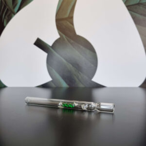 Elegancka i funkcjonalna lufka szklana z zielonymi kulkami, wykonana ręcznie z wysokiej jakości szkła. Wyposażona w zielone kulki wewnątrz, które zapewniają swobodny przepływ powietrza, oraz specjalne wypustki zapobiegające zsunięciu lufki ze stołu.